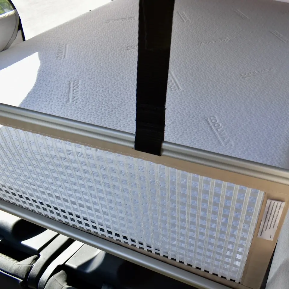 Ouverture et fermeture par sangles assistées par vérins à gaz, pour une utilisation fluide et durable. Aucun système électrique : zéro risque de panne. La toile comprend 3 fenêtres : une frontale entièrement ouvrante et deux latérales avec moustiquaires.