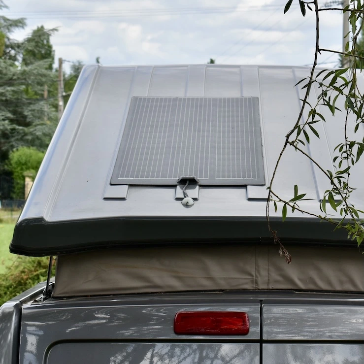 Panneau solaire : Installez un panneau solaire souple avec passe-câble étanche sur le toit relevable pour profiter d’une autonomie électrique lors de vos roadtrips.